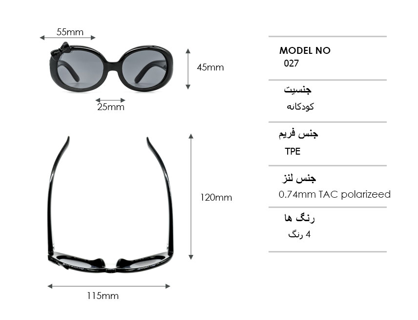 این لنز *پلاریزه و دارای کیفت بالا می باشد. طول دسته عینک 120mm و طول فریم آن 115mm است.