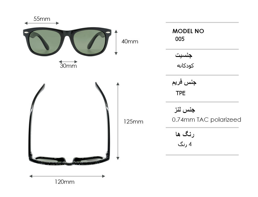 این لنز *پلاریزه و دارای کیفت بالا می باشد. طول دسته عینک 125mm و طول فریم آن 120mm است.