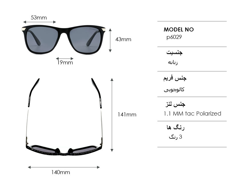 این لنز *پلاریزه و دارای کیفت بالا می باشد. طول دسته عینک 141mm و طول فریم آن 140mm است.